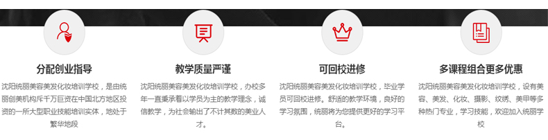 沈阳市统丽美容美发培训学校是一家拥有多年教学经验专业技能培训学校,师资阵容强大,多名老师曾担任过春晚化妆形象设计师、大赛评委、考评员等职位,以独具特色的教学风格,为广学员提供专业的指导。