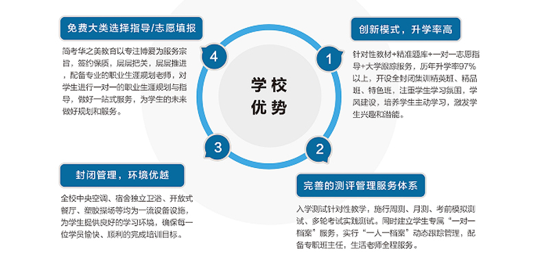 近几年,单招是一个很有热度的话题,这也是教育部门考虑到一些考生的实际情况,而出台的一种高校选拔学生的方式,使得人们有了更多的选择机会。为参加单招做准备,可以到单招培训机构学习。河北简考华之美教育是专注为中等职业学校和高中学校的单招考生提供优质的一站式升学服务平台,采用封闭式教学管理,为学生提供良好的学习环境,开设精英班、精品班、特色班等班型,配备专职班主任,生活老师全程服务,全方位为学员保驾护航,确保每一位学员愉快、顺利的完成培训目标。